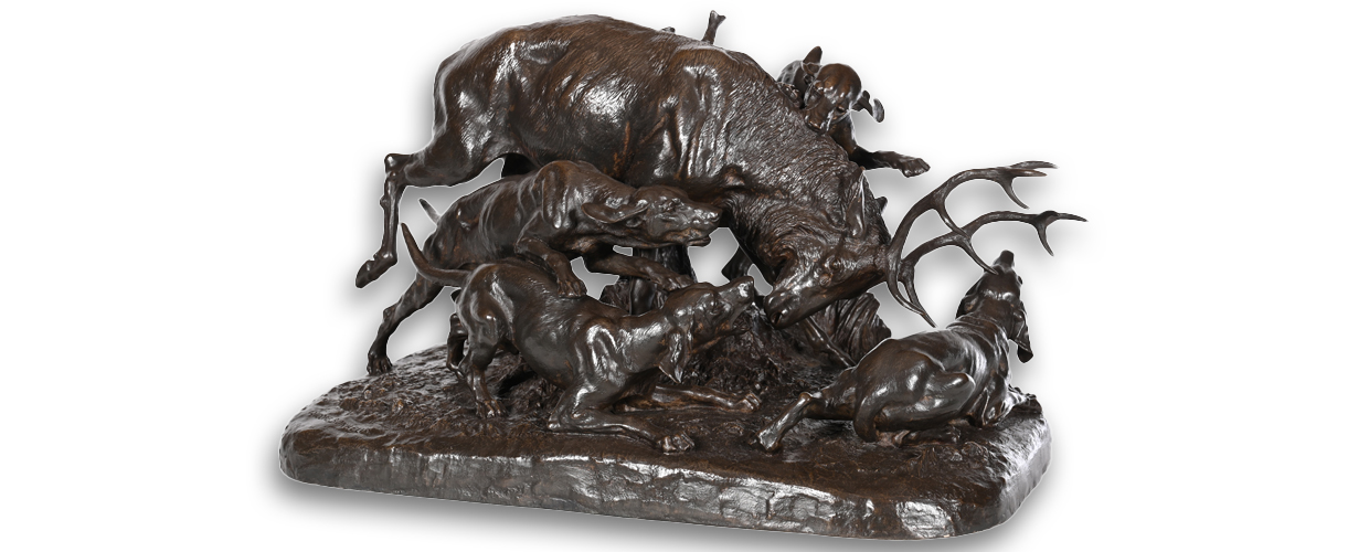 La Charge du sanglier est l’un des modèles les plus recherchés de Jules Moigniez. Dans son oeuvre essentiellement consacré à la cynégétique, ce groupe est l’un des plus complexes et des plus maîtrisés.